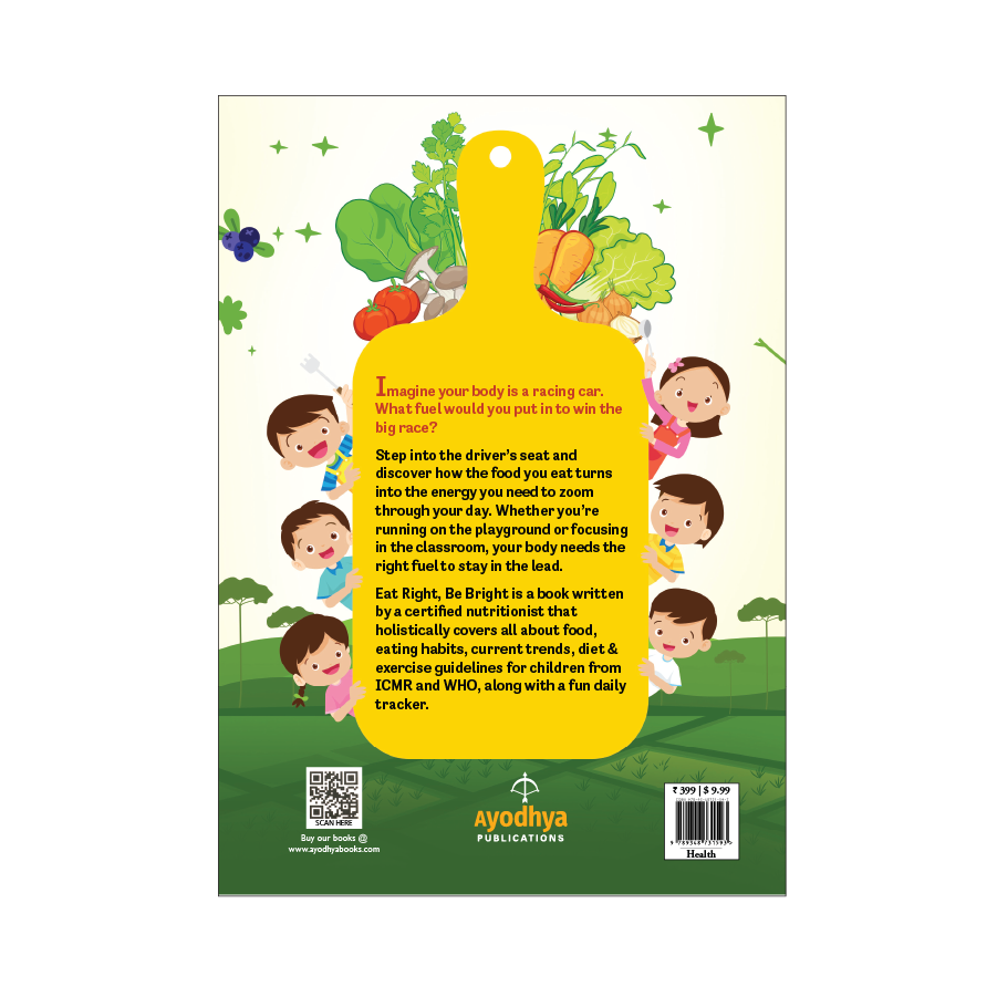 Eat Right, Be Bright is a book written by a certified nutritionist that holistically covers all about food, eating habits, current trends, diet & exercise guidelines for children from ICMR and WHO, along with a fun daily tracker.