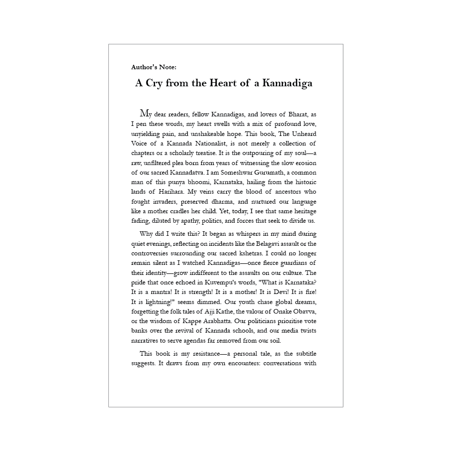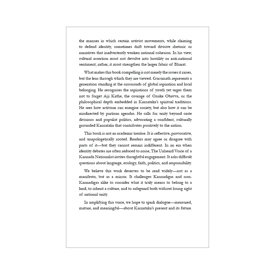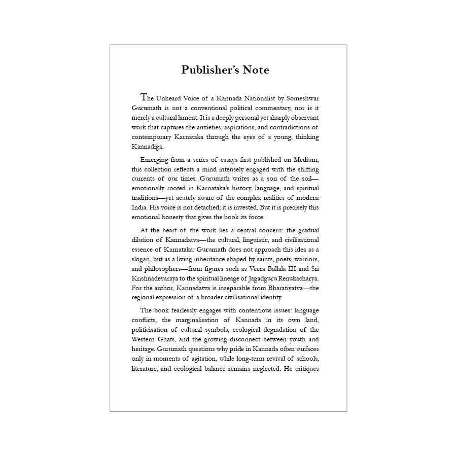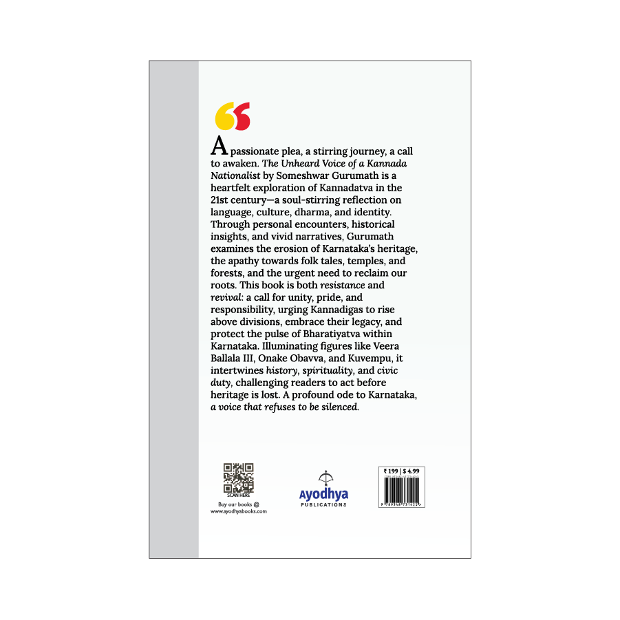 A passionate plea, a stirring journey, a call to awaken. The Unheard Voice of a Kannada Nationalist by Someshwar Gurumath is a heartfelt exploration of Kannadatva in the 21st century—a soul-stirring reflection on language, culture, dharma, and identity. Through personal encounters, historical insights, and vivid narratives, Gurumath examines the erosion of Karnataka’s heritage, the apathy towards folk tales, temples, and forests, and the urgent need to reclaim our roots. This book is both resistance and revival: a call for unity, pride, and responsibility, urging Kannadigas to rise above divisions, embrace their legacy, and protect the pulse of Bharatiyatva within Karnataka. Illuminating figures like Veera Ballala III, Onake Obavva, and Kuvempu, it intertwines history, spirituality, and civic duty, challenging readers to act before heritage is lost. A profound ode to Karnataka, a voice that refuses to be silenced.