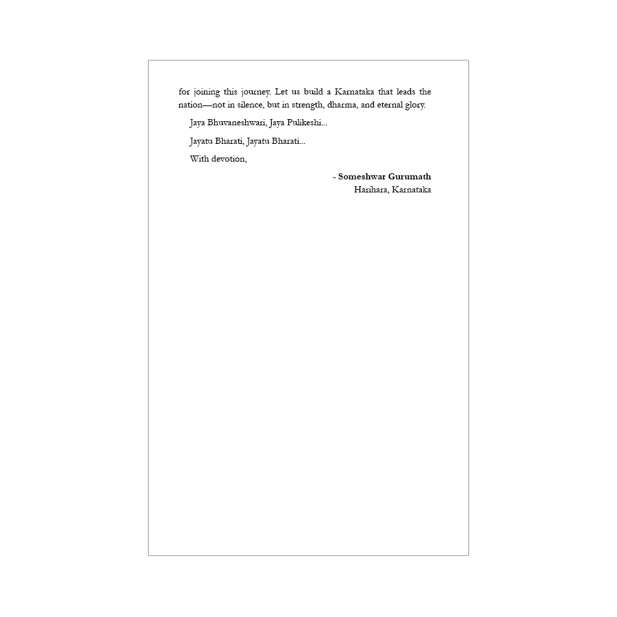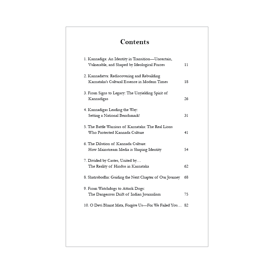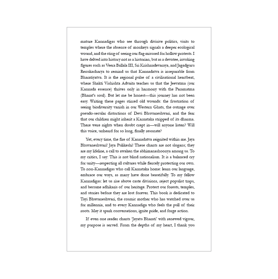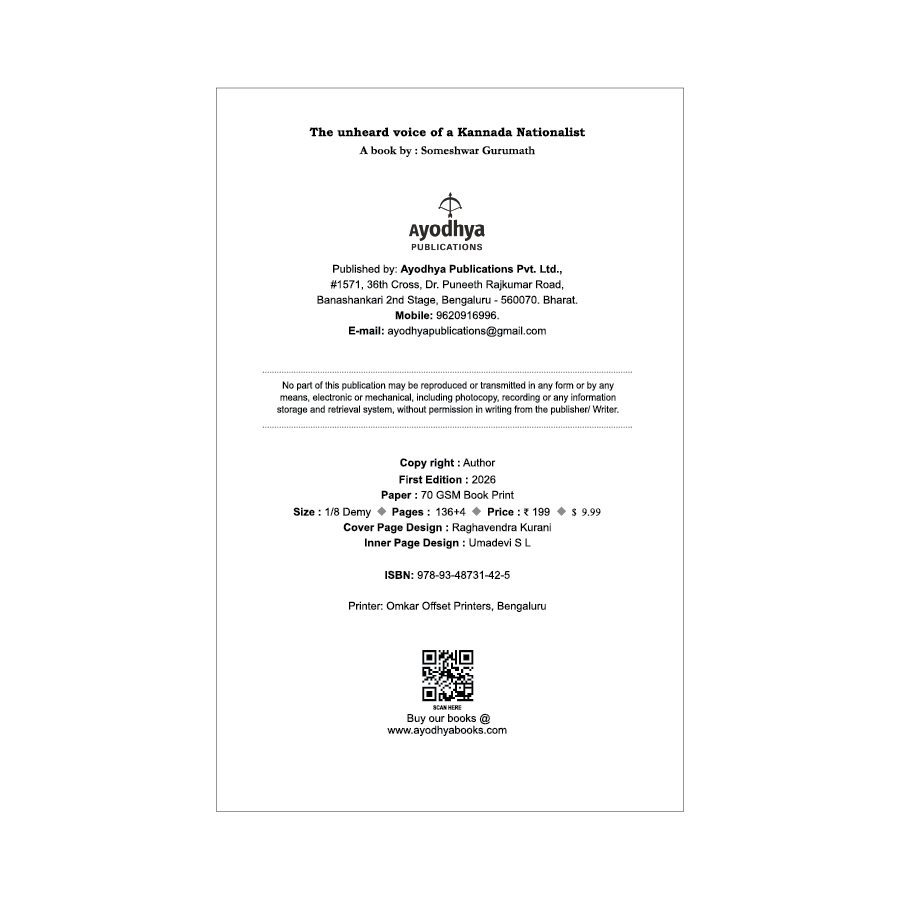A passionate plea, a stirring journey, a call to awaken. The Unheard Voice of a Kannada Nationalist by Someshwar Gurumath is a heartfelt exploration of Kannadatva in the 21st century—a soul-stirring reflection on language, culture, dharma, and identity. Through personal encounters, historical insights, and vivid narratives, Gurumath examines the erosion of Karnataka’s heritage, the apathy towards folk tales, temples, and forests, and the urgent need to reclaim our roots. This book is both resistance and revival: a call for unity, pride, and responsibility, urging Kannadigas to rise above divisions, embrace their legacy, and protect the pulse of Bharatiyatva within Karnataka. Illuminating figures like Veera Ballala III, Onake Obavva, and Kuvempu, it intertwines history, spirituality, and civic duty, challenging readers to act before heritage is lost. A profound ode to Karnataka, a voice that refuses to be silenced.